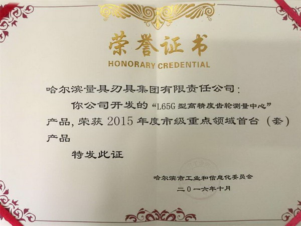 哈量集团公司研制的“L65G型高精度齿轮测量中心”荣获2015年度市重点领域首台(套)产品称号。